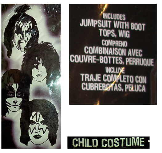Costume Child: b/w faces on left: jumpsuit, boot tops & wig: Demon, Catman